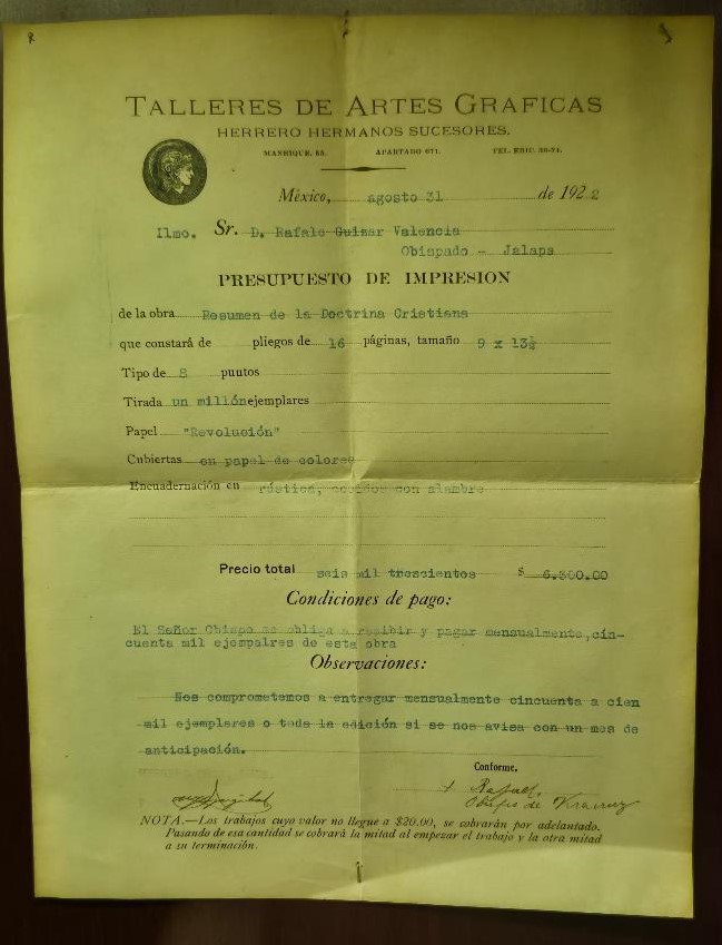 En su museo, que esta cerca de la Catedral de Jalapa, se puede ver este recibo firmado por Él, un recibo en donde encarga UN MILLÓN DE EJEMPLARES DEL Resumen de la Doctrina Cristiana. Aunque no costa que sea así, me gusta pensar que gran parte de este material, fue enviado a Tabasco para ayudar a su recristianizacion. El pudo haberse excusado y decir que no era su Diócesis.. que no era asunto suyo.. etc… pero tenia un pensamiento Católico, universal, y por eso envío catequistas y abundante material religioso a Tabasco, para a traerlo a Cristo nuevamente.